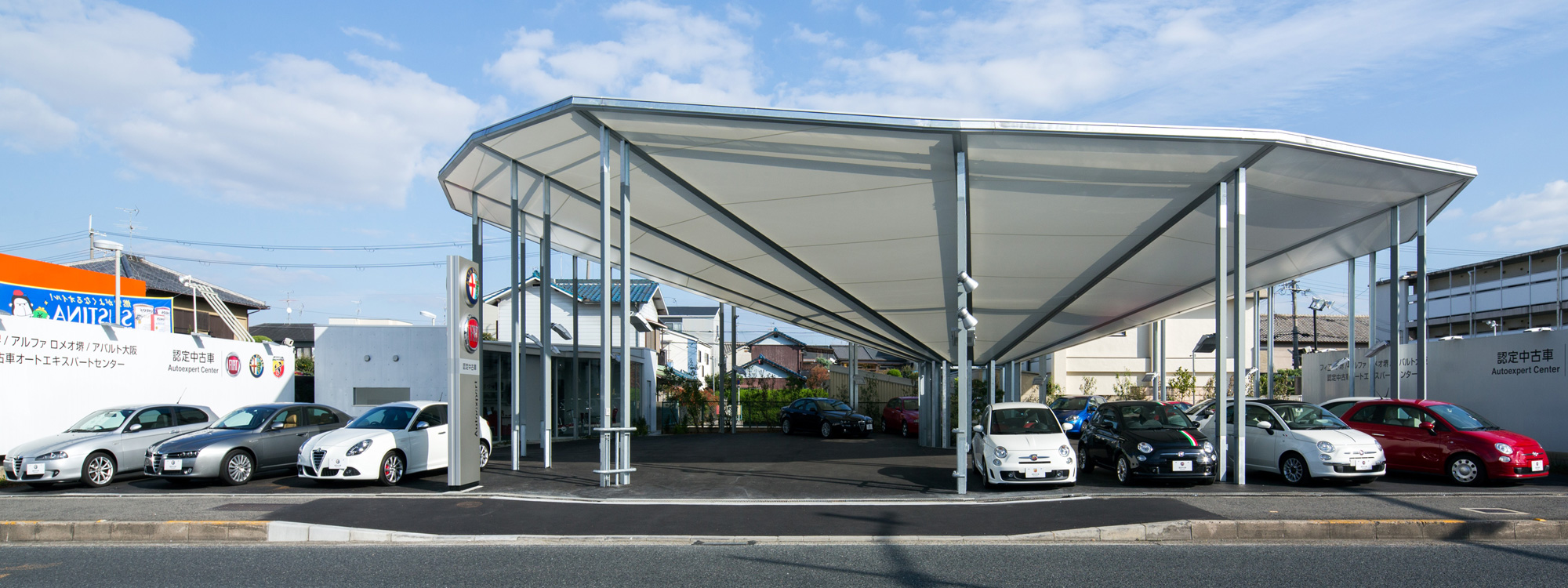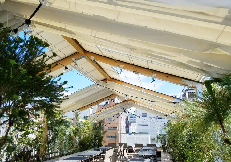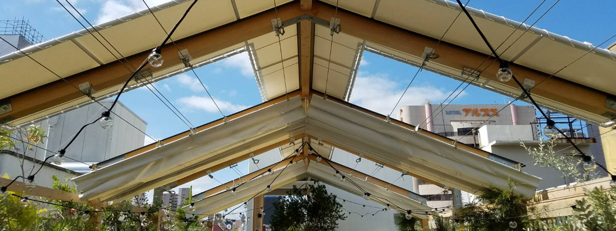 テントと申しますと、みなさまキャンプなどのテントを思い浮かべますが、私共が製作しておりますのは、店先などの軒先テント、オーニング、工場などの天井テント、開閉テント、間仕切り。